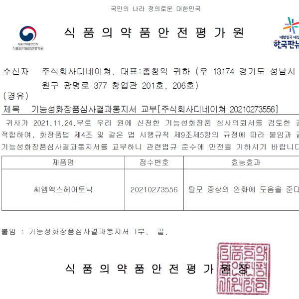 식약처 임상시험평가 최초허가 탈모증 기능성화장품으로 주2회 사용 30회분 3개월 분량